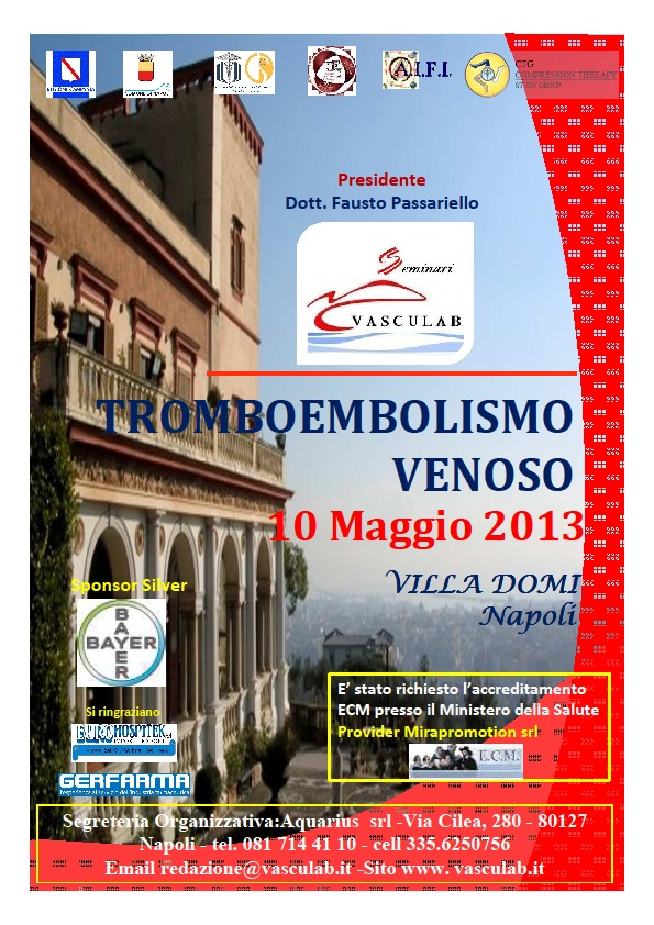 Il programma del convegno "Tromboembolismo venoso" che si svolgerà a Napoli, presso la Villa Domi, il 10 maggio 2013. L'evento è riservato solo a Medici delle specialità Chirurgia Vascolare, Chirurgia Generale, Cardiologia Medicina Interna, Medicina Generale, Radiologia. la registrazione deve avvenire solo online sul sito Vasculab.it