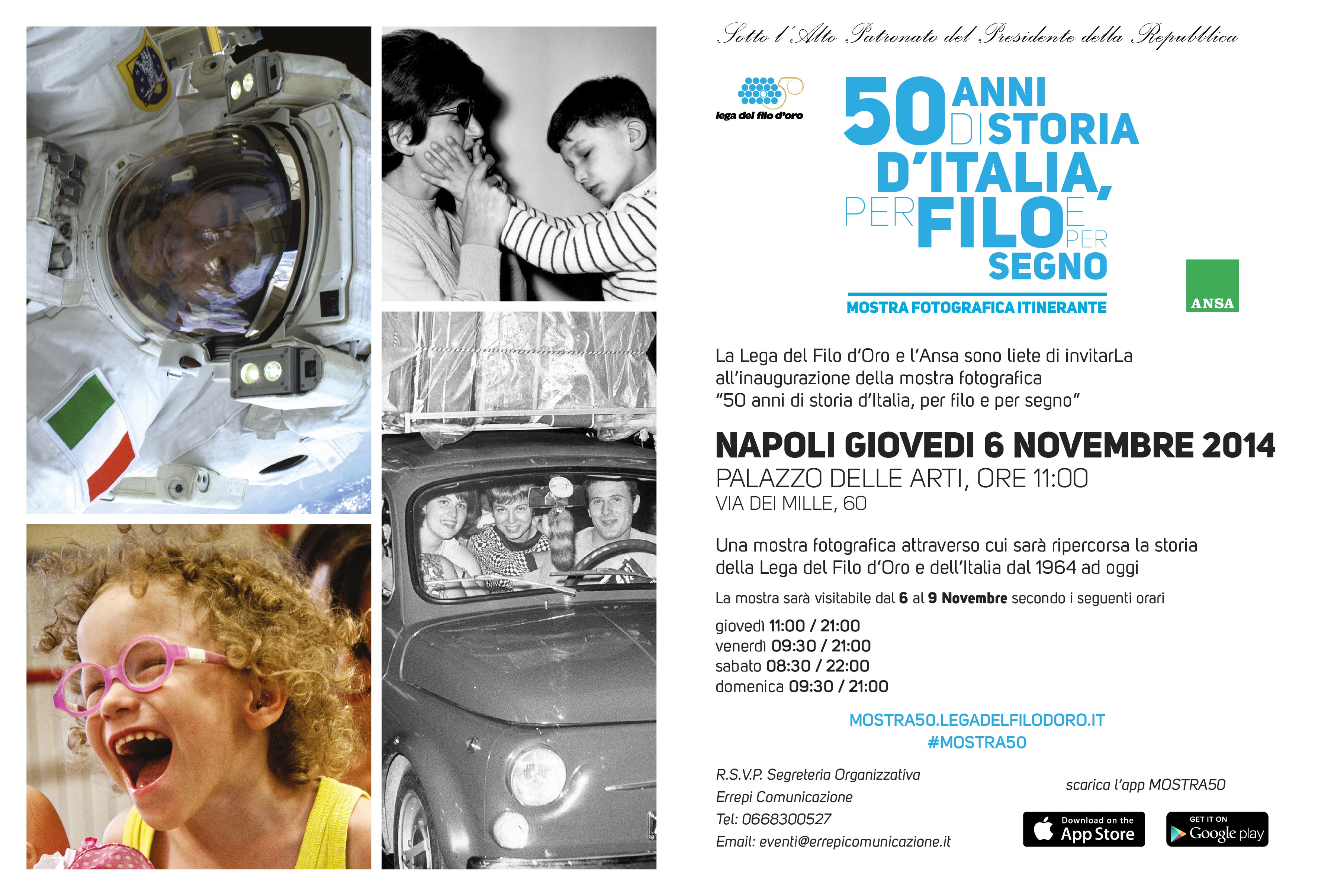 Siamo lieti di comunicarvi che dal 6 al 9 novembre al Palazzo delle Arti sarà visitabile la mostra fotografica "50 anni di storia d'Italia, per filo e per segno", una mostra che la Lega del Filo d'Oro realizza in collaborazione con l'agenzia stampa ANSA per celebrare il cinquantesimo anniversario della fondazione della Lega del Filo d'Oro, avvenuta nel 1964.