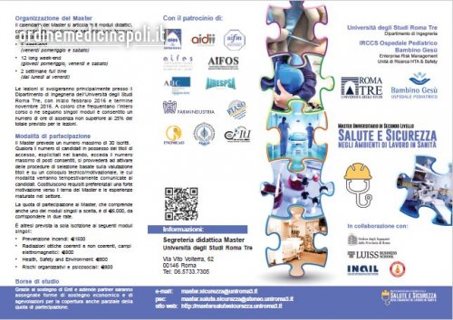 Il Master di II livello in "Salute e Sicurezza negli ambienti di Lavoro in Sanità", nato da una partnership tra l’Università degli Studi Roma Tre e l’Ospedale Pediatrico Bambino Gesù, ha durata da Febbraio a Dicembre 2016.