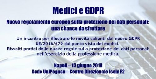 Si pubblica, in allegato, il programma dell'incontro dal titolo "Medici e GDPR. Nuovo regolamento europeo sulla protezione dei dati personali: una chance da sfruttare", che si terrà il 13 Giugno 2018 presso la sede UniPegaso del Centro Direzionale Is. F2.