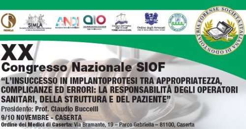 Si pubblica, in allegato, il programma del XX Congresso Nazionale SIOF dal titolo "L'INSUCCESSO IN IMPLANTOPROTESI TRA APPROPRIATEZZA, COMPLICANZE ED ERRORI: LA RESPONSABILITÁ DEGLI OPERATORI SANITARI, DELLA STRUTTURA E DEL PAZIENTE", che si svolgerà presso l'Ordine dei Medici di Caserta in data 9 e 10 novembre c.a.