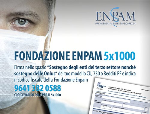 Si ricorda che è possibile destinare il proprio 5 x 1000 alla Fondazione Enpam 5x1000 - Onlus. Per fare ciò, al momento della dichiarazione dei redditi, basta firmare e indicare nello spazio "Sostegno degli enti del Terzo settore nonché sostegno delle Onlus", il codice fiscale (valido solo per il 5 x 1000)